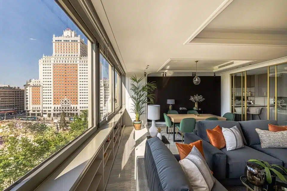 El diseño interior del nuevo apartamento se ha planteado como un espacio luminoso, moderno y muy amplio, que dé protagonismo a las vistas privilegiadas sobre la plaza de España. ¡Tanto a los visitantes que buscan un alquiler por meses en Madrid centro como a aquellos que llegan a la capital por motivos laborales, les costará abandonar la comodidad del apartamento para salir al bullicio de la gran ciudad!